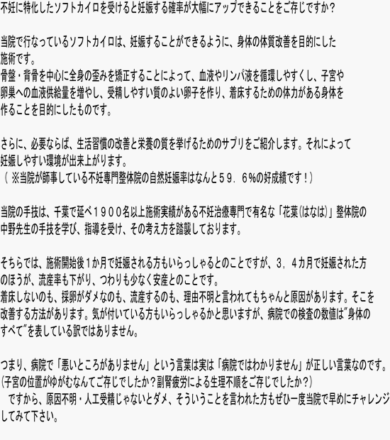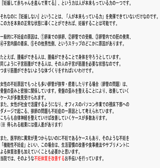 当院では、内臓下垂を調整することで臓器本来の能力を取り戻し、人が本来もってい“生きる力”を回復することで妊娠・出産・健康な赤ちゃんの発育を目指していこうという方針で行なっております。