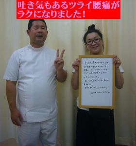 「立ったり座ったりが大変で、ここ2週間吐き気もあるような腰痛で、ホントに悩んでいたのですが、1回の施術でとてもラクになりました。