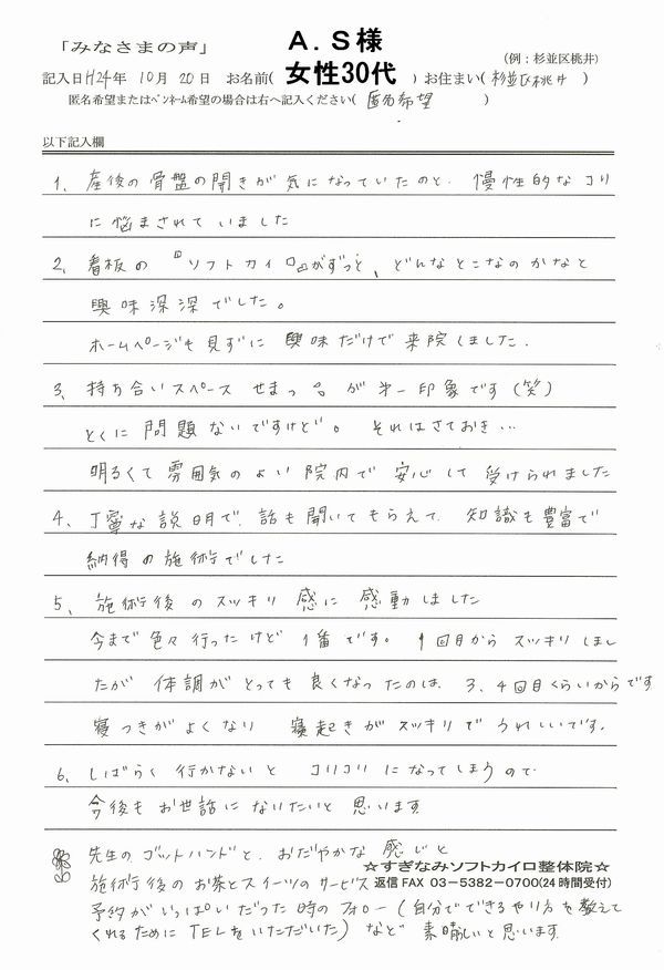 平成24年10月20日 A.S様 女性30代(杉並区桃井)