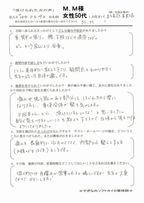 A3.痛みや張り感のある部分はほぐれるので楽になりますし、身体全体が整う気がします。3回目くらいから、続けているといいな!と思いました。自分で気をつけるといいことも教えて下さるので日頃から気をつけるようになりました。