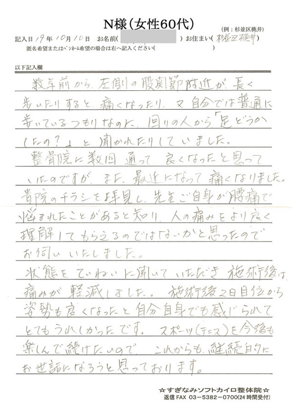 数年前から左側の股関節付近が長く歩いたりすると痛くなったり、又自分では普通に歩いているつもりなのに、周りの人から「足どうかしたの?」と聞かれたりしていました。
