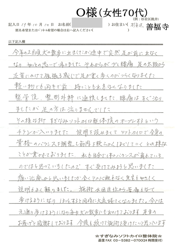 その様な折、すぎなみソフトカイロ整体院のオープンするというチラシが入りました。 説明を読みましてソフトカイロで全身の骨格のバランスを調整し筋肉をやわらかくほぐしていくとの様なことが書かれておりました。 私も自分で体のバランスが崩れているのではと思っていましたので、すぐに受けてみようと思いました。