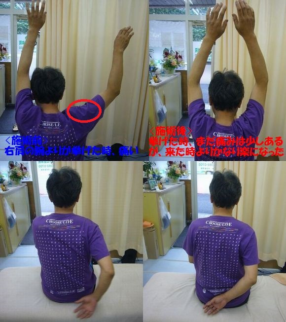五十肩の痛みのBefore-Afterの写真です。 この方は半年前に腰痛の施術を当院で行なっています。ここ2週間右手を挙げると腕のつけ根に痛みが走る、腰に手がまわすと痛いとのこと。 1回の施術で右側の状態になりました。