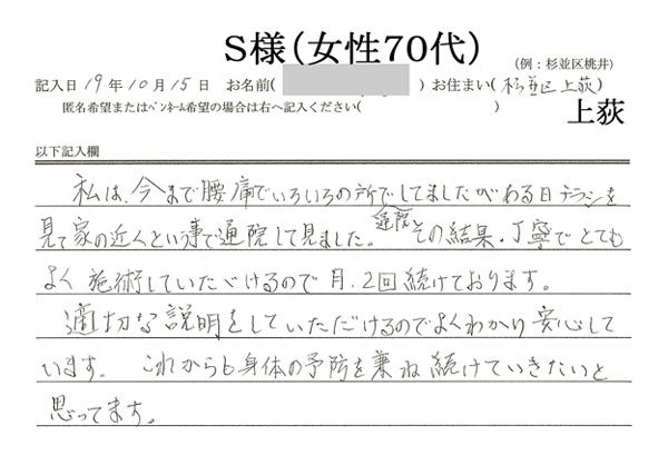 私は今まで腰痛でいろいろの所で通院していましたが、ある日チラシを見て家の近くという事で通院してみました。