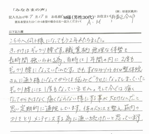 でもすぎなみソフトカイロ整体院さんに通う様になってからは悩みでクセになってしまっていたギックリ腰には1度もなっていません。そして今では痛くなってからではなく、痛くならない様にする事が大切なんだと思い定期的に通院しています。