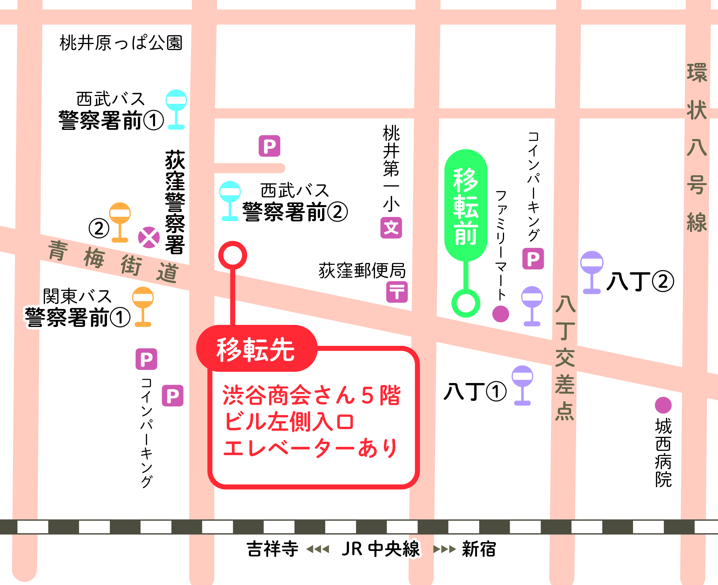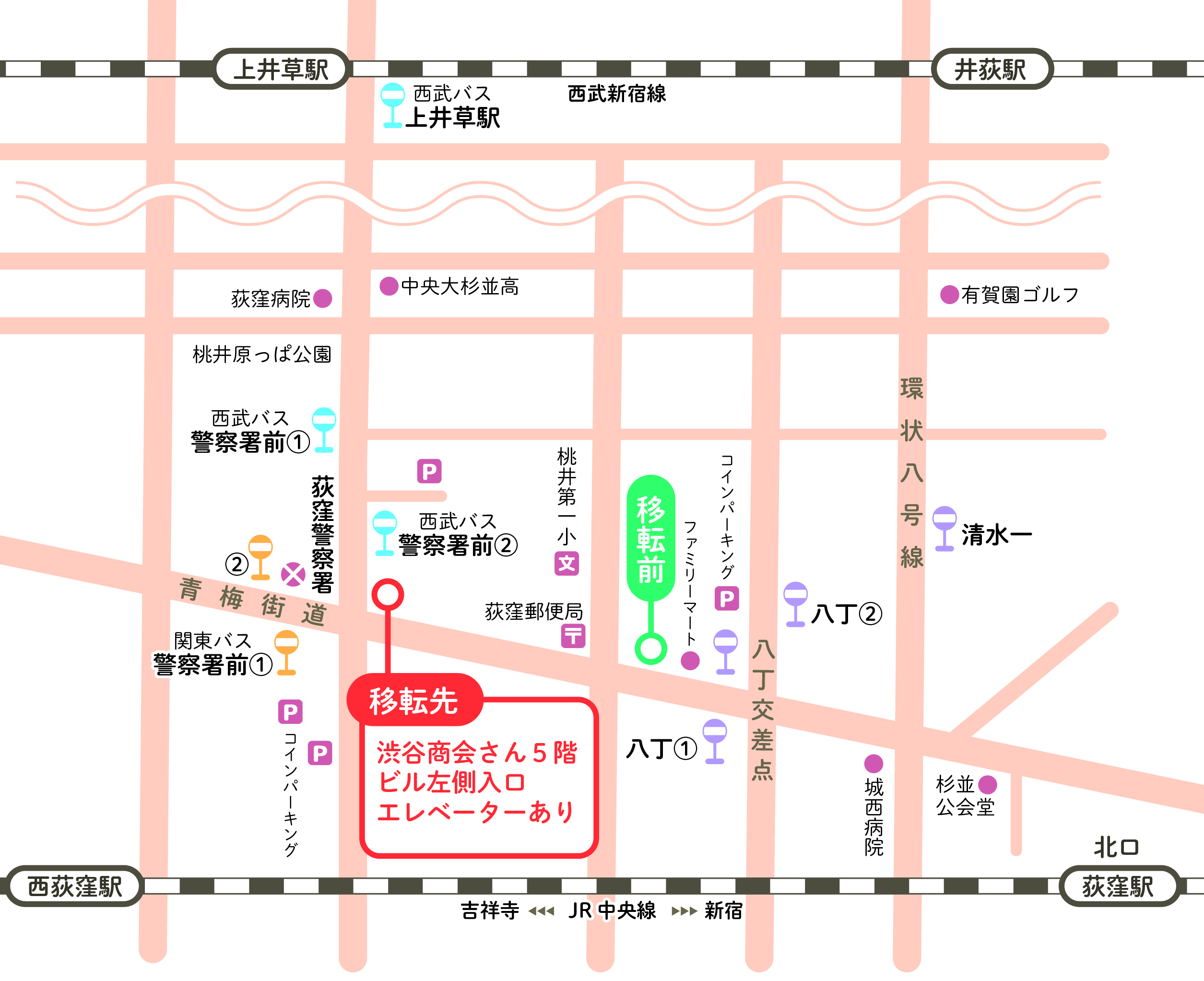 ⇒西武バス「荻窪駅行き」乗車15分「荻窪警察署前②」下車徒歩1分