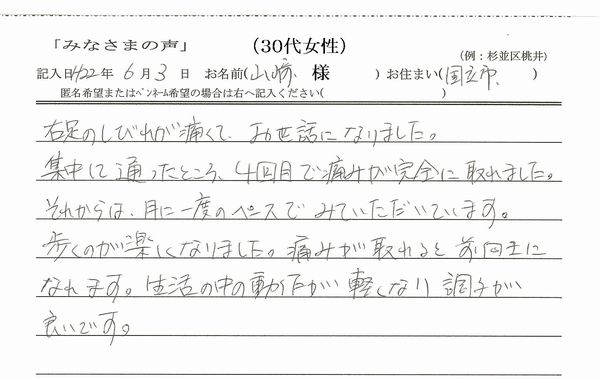 ※院長より・・・山崎さんは趣味でピアノを弾かれていて、発表の前は練習も多くなり特に首肩にくるようです。お腹も施術することで毎回足の内側が温かくなるとのことです。
